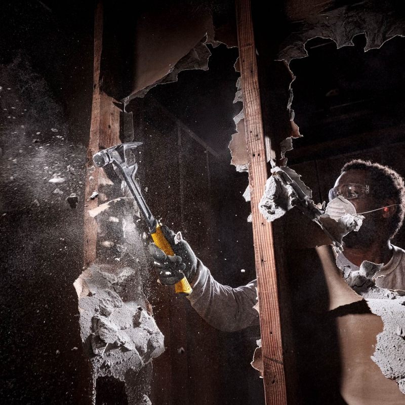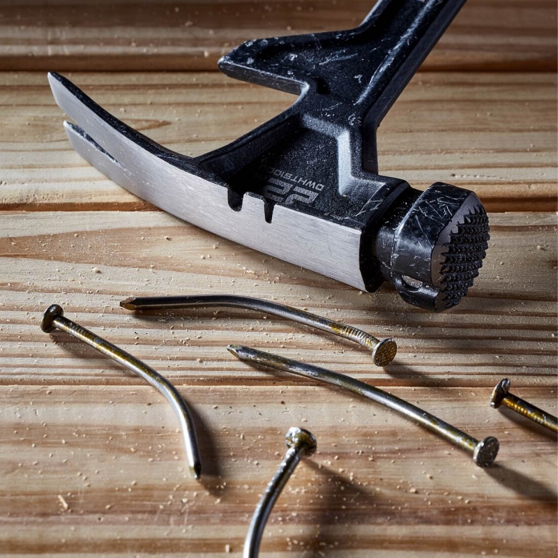 The DEWALT TOUGHSERIES 22 oz. Demo Hammer offers one-piece steel construction and a thick, heat-treated steel shaft for jobsite durability. Its balanced design and extended claw provide a smooth swing and easy board grabbing. The large, milled strike face quickly breaks through drywall, while Tri-Pull technology allows for versatile nail removal.