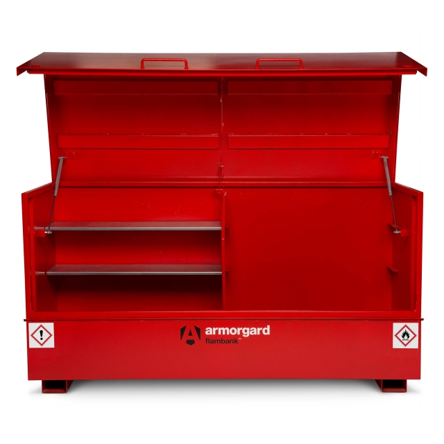 Flambank Hazardous Storage Chest. Fully complies with all regulations for the safe storage of chemicals and flammables Popular for external fixed applications where security is also an issue Fully welded and tested sump base to prevent leakage Ultra-robust 5-lever deadlocks on both sides and anti-cut rollers in deadbolt Robust chubb style keys supplied High and low level ventilation to prevent build-up of fumes Flame arrester gauze fitted on all boxes Finished in bright red with relevant hazard warning signs fitted as standard Built to specification for 30 minute fire resistant Supplied with a divider in the centre of the box and 2 x removable shelves