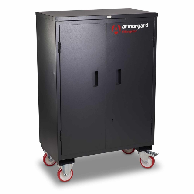 | Features & Benefits | Fittingstor; Mobile Fittings Cabinet. Designed to secure and organise copper fittings and cable alongside the tools and equipment. Heavy duty sheet steel construction; Slightly different design to the other sizes in the FittingStor range; with slide out welded shelves and compartments. Fitted with twin 5 lever deadlocks and serial numbered for replacement keys. Supplied on 4 x 6'' extra heavy-duty castors and recessed handles to enable it to be easily manoeuvred |