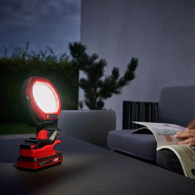 The Einhell GC-OL 18/1500 Li-Solo cordless outdoor lamp delivers bright, flexible lighting for gardens, workshops, or camping trips. Powered by a Power X-Change lithium-ion battery, it provides up to 1500 lumens of cool white light (7000 K) with three brightness levels. The 36-LED lamp offers a 4 m illumination range, and its 11 cm head rotates 290° horizontally and 300° vertically for optimal positioning. A rubberised clip allows easy attachment to tables, shelves, or tent poles, while the integrated handle makes it portable for use as a torch. Battery and charger are sold separately.